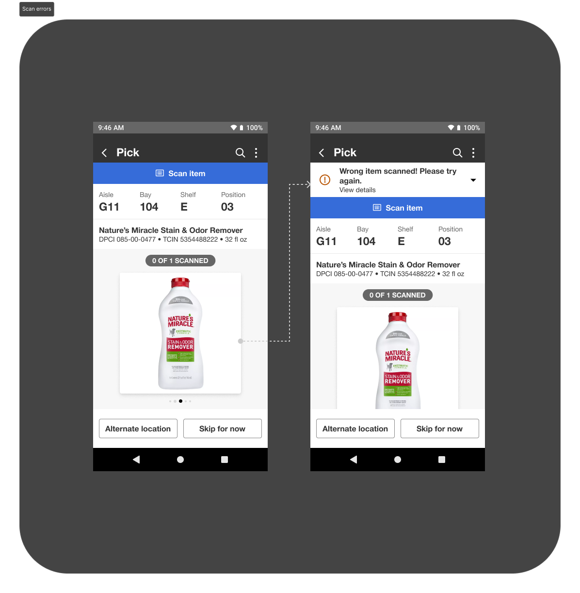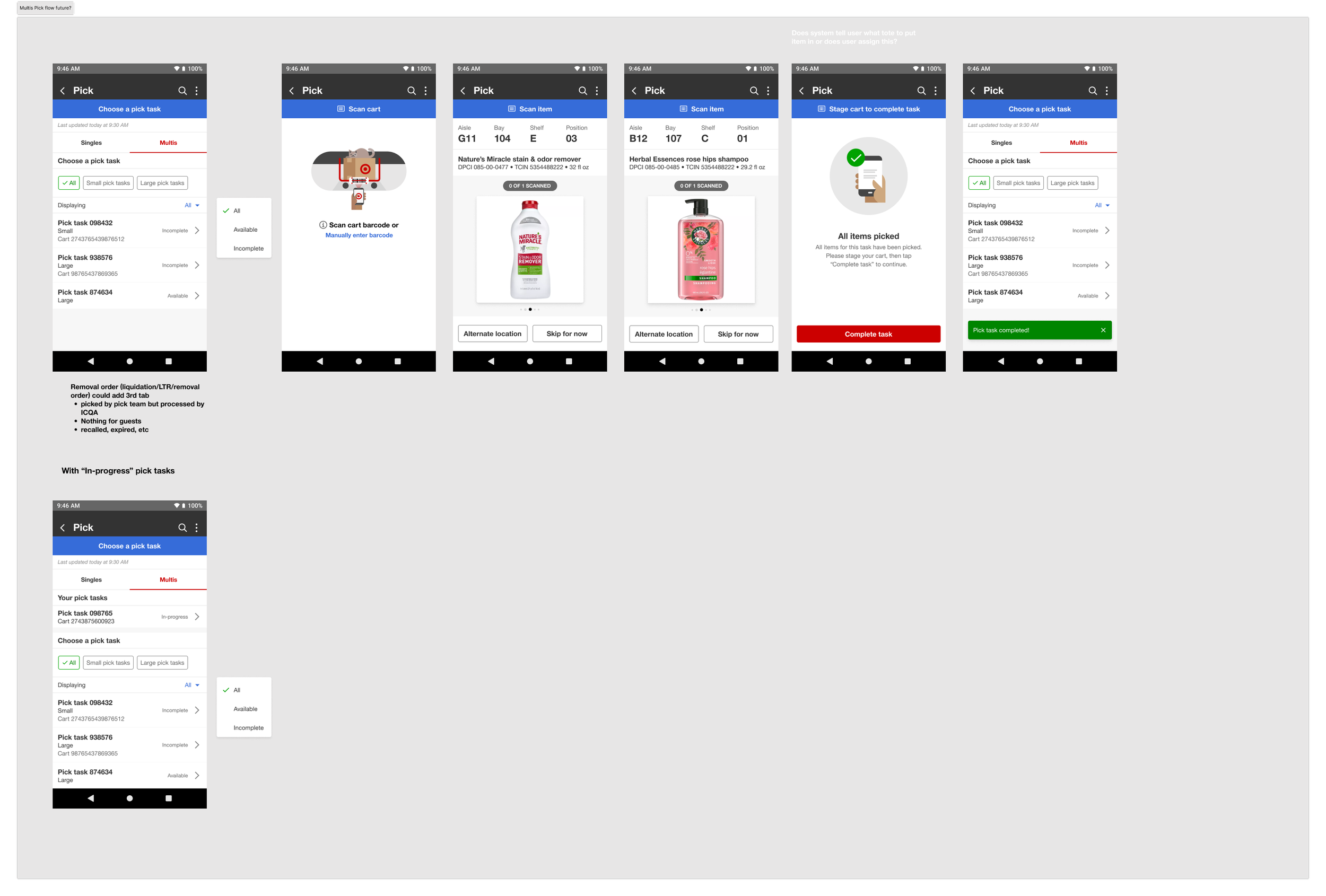 While leading the design of the Singles Pick user flow, I intentionally considered the broader fulfillment system, including the Multis Pick process. Although both flows share similar picking behaviors, Multis involves picking multiple items per order, while Singles focuses on one item per order—making it critical to clearly articulate where the experiences diverge.
