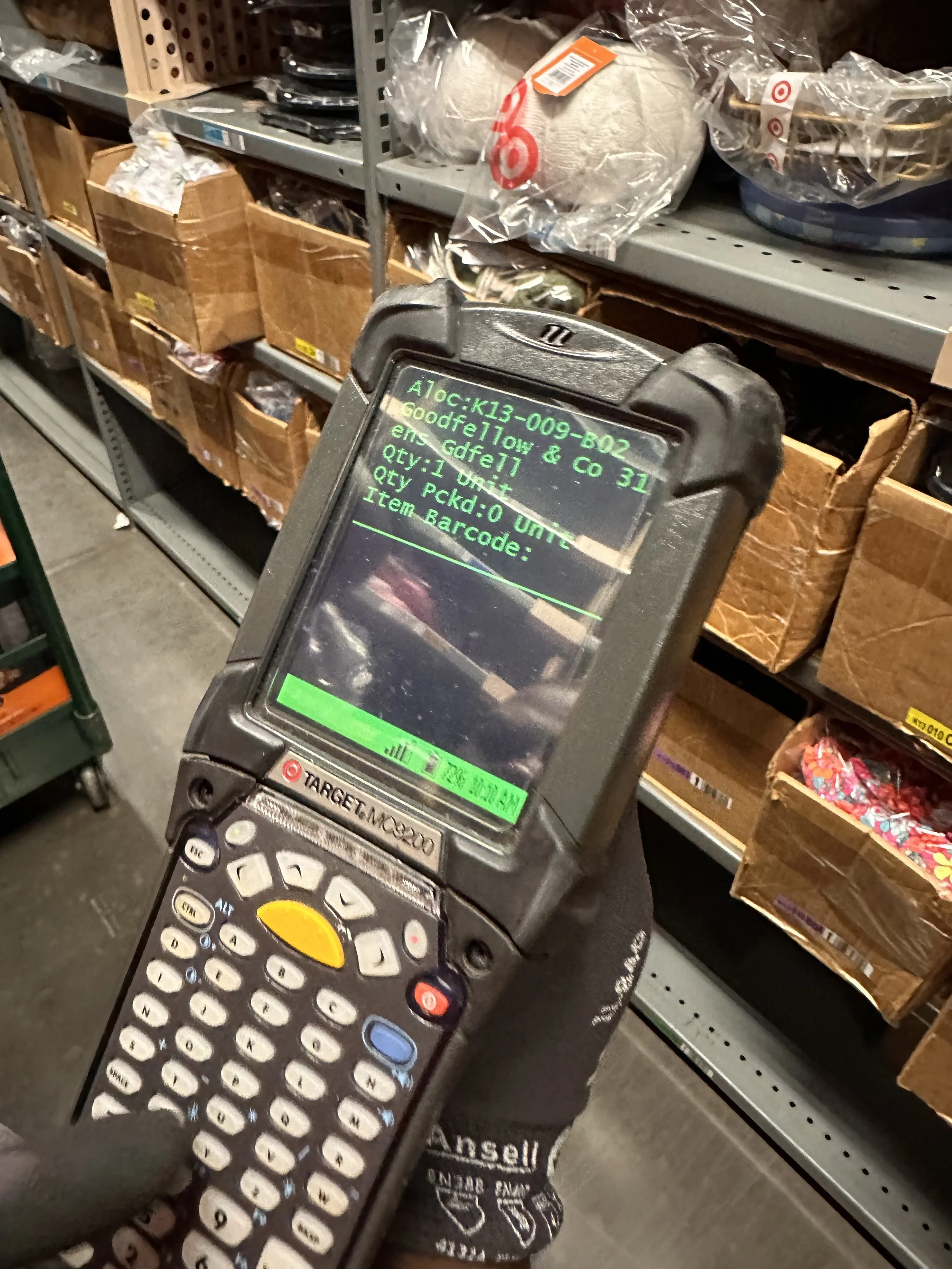 The screen on the device tells the pick what item to pick, by showing them the brand and item description, where to locate the item, and what bin the item is in.