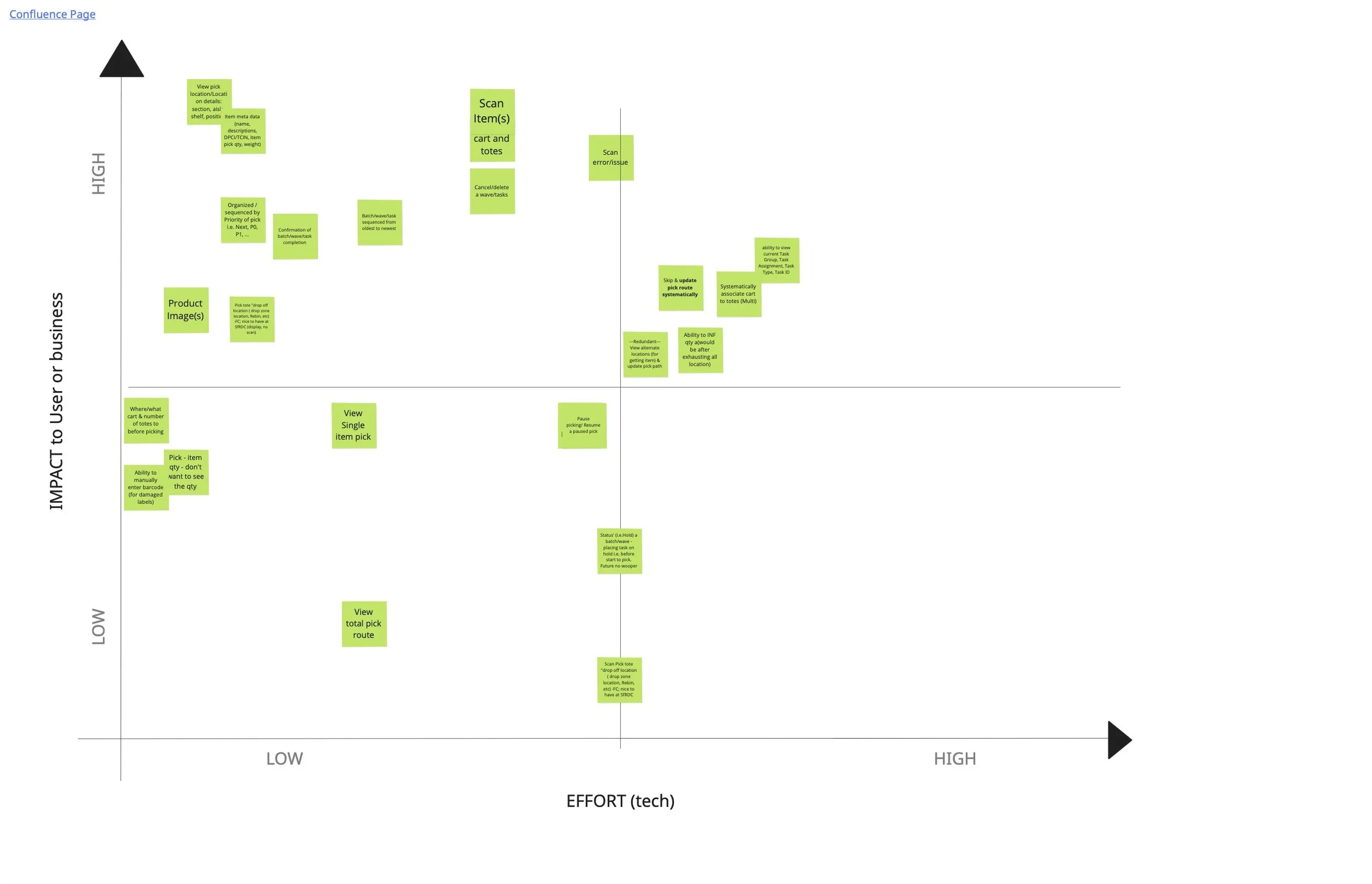 As our first step in ideation, the product team + engineers met to discuss feature prioritization and product requirements. We discussed impact to users or business and how much effort would be required from tech. After our meeting, we met with stakeholders and leveraged their knowledge regarding pick processes to further narrow down our list of product requirements.