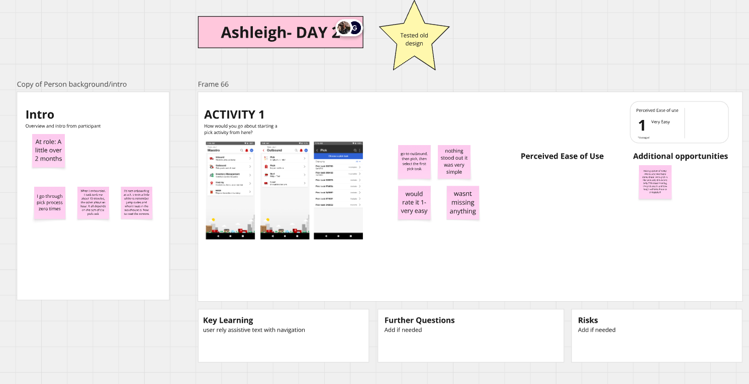 I led six user testing on our prototype while the product research team captured insights and feedback. Participants represented a range of roles within the pick workspace, including two leaders and four team members, allowing us to gather perspectives from across the workflow. Our focus became to identify usability issues, inefficiencies, and discover opportunities in order to maintain positive user experience and learn about our users. For our testing, we had users complete the pick task within the system by assigning them tasks and scenarios