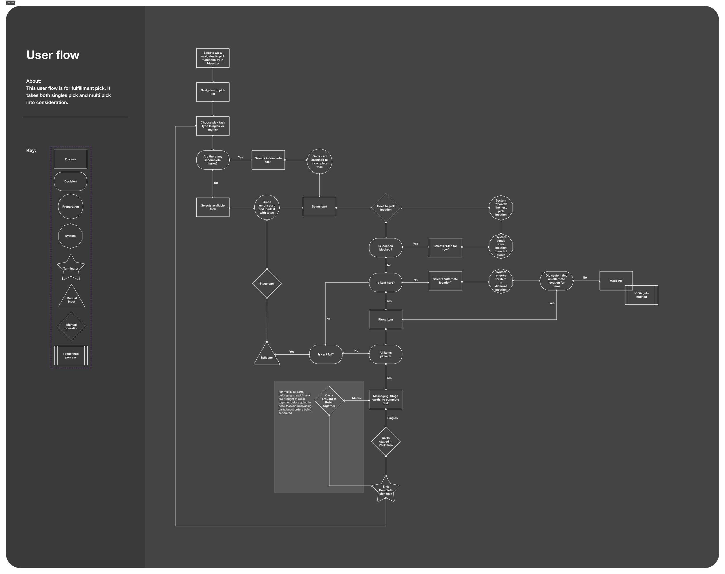 I designed the user flow to explicitly surface decision points, user versus system actions, and manual versus guided steps. This systems-level mapping created shared clarity across product, design, and engineering, and established a strong foundation for a future Multis Pick redesign. Ultimately, this work helped the team define what a guided enterprise workflow could look like and supported the development of our proof of concept.
