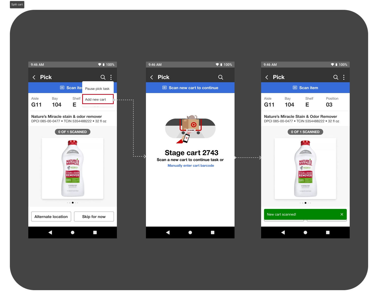 Users completed key workflows including scanning carts, picking tasks, using alternate locations, and staging carts using our prototype. Each participant tested a unique scenario, documented on an individual board.