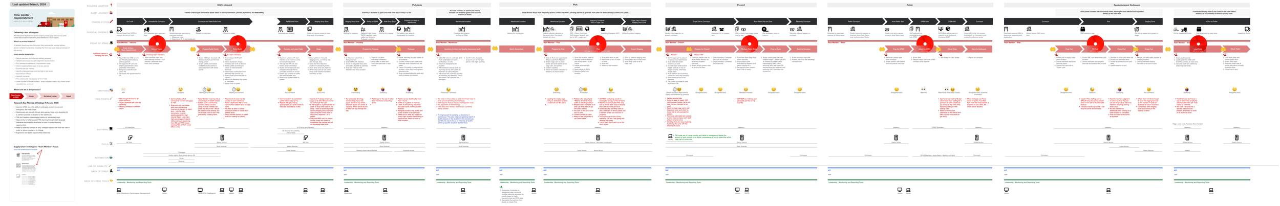 We synthesized our findings into a comprehensive service blueprint that mapped the end-to-end flow of products through the warehouse, including handoffs, tools and software in use, and key pain points.